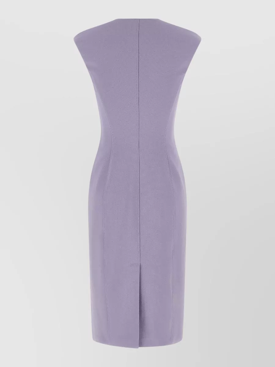 Fitted through the bust, waist, and hips with a defined, structured silhouette and knee-length hem