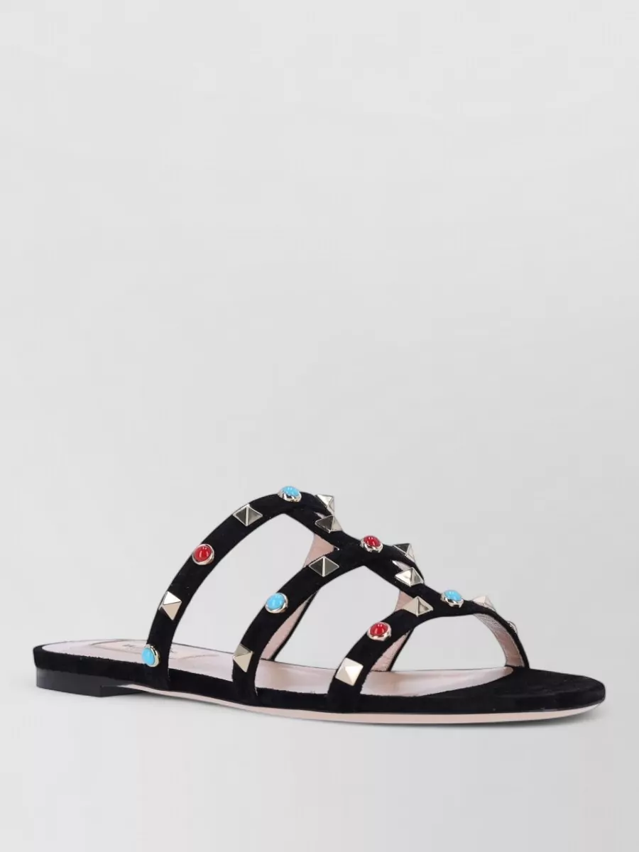 Flat sandal with slim studded straps that hold the foot securely while leaving the toes and heel open