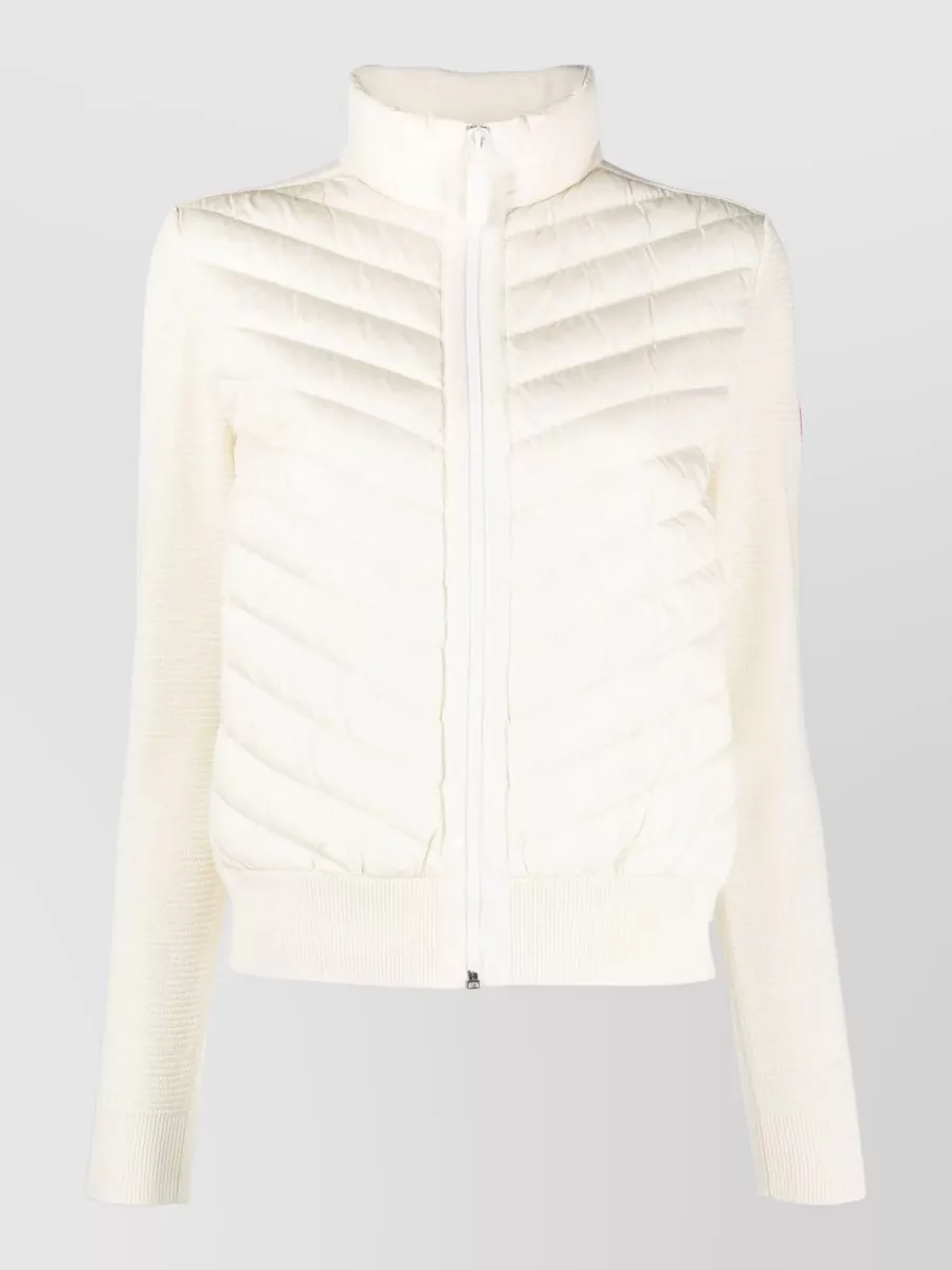 Features a regular, structured silhouette through the body with a high collar and quilted front panel